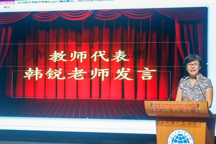 接着,文化系主任韩锐作为教师代表进行发言,她向新生介绍了金沙城线路检测中心师资情况和文化氛围等,她告诫新生珍惜光阴,认真学习;鼓励新生博览群书,提升眼界;希望同学们拥有理想,努力奋斗,提升个人素质,莫被挫折打倒。