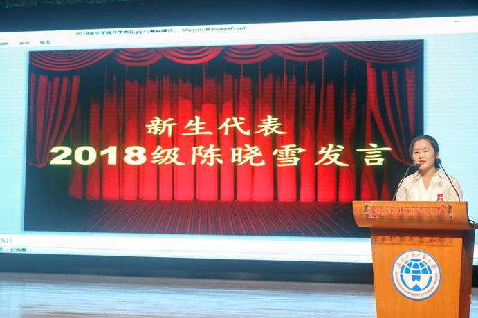 典礼尾声,“广东省优秀学生”、“校十佳学生干部”、来自2018级1班的新生代表陈晓雪同学进行了发言。首先,她表达了对广外的憧憬以及为翻译梦付出努力的决心。随后,她以 “独善其身者,难成大事”,提倡学会与他人合作,走出自己的舒适圈,并引用引用泰戈尔诗句“当我们大为谦逊之时,便是我们最接近伟大的时候”表达了对未来的希冀。最后,她以“以梦为马,不负韶华”,表达了对于大学生活的憧憬和向往。