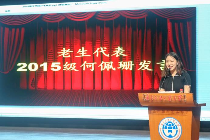 随后,“广外十佳青年”、国奖奖学金获得者2015级何佩珊同学作为老生代表进行了发言。她回顾了自己的大学生活学习经历,分享了自己的所思所感,最后以“你们需要英文,英文的明天需要你们”向在场新生表达了衷心的期望。新生代表2018级陈晓雪同学进行了发言,她表达了对广外的憧憬以及为翻译梦付出努力的决心,她引用泰戈尔诗句“当我们大为谦逊之时,便是我们最接近伟大的时候”表达了对未来的希冀以及和全体新同学共同努力的愿景。