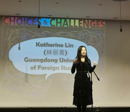 12月7日晚,演讲比赛如期进行。在有备演讲环节,林丽菁聚焦国内留守儿童的问题,并以易烊千玺的例子来说明青年人有能力去改善留守儿童的生活,并为中国的发展做出贡献。她还用自己的志愿经历来鼓励所有的青年人加入到帮助留守儿童的行列中。她流畅、大方的演讲博得了在场观众的阵阵掌声。