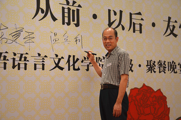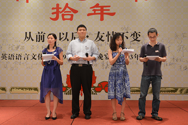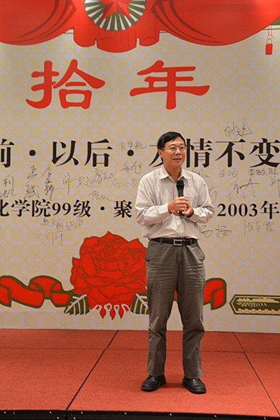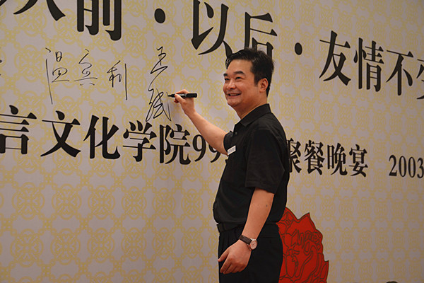 院党委书记王斌受学院教师的重托,代表学院欢迎同学们毕业10年后从世界各地,风尘仆仆返校母校,共述当年情谊。并以“同窗聚首广外,感人生之苦短,探命运之多桀,论创业之艰辛,道友情之珍重” 来抒发自己的感慨。他在同学们的掌声中提议:祝福同学们在未来的日子里一帆风顺!