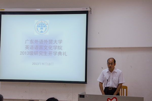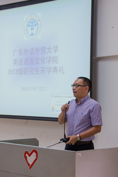 开学典礼开始,院长温宾利致欢迎辞。温院长首先对2013级全体研究生加入英文大家庭表示热烈的欢迎,并对全体研究生寄予了殷切的期望。他强调,作为一名研究生,必须要明确自己的奋斗目标,结合自身的特点努力前进;而在前进过程中,研究生应该具备两种品质:其一是不排斥理论,其二是具有批判性思维。温院长认为,同学们在学习知识、钻研学术的过程中,还要学会做人,努力成为德才兼备的人才。