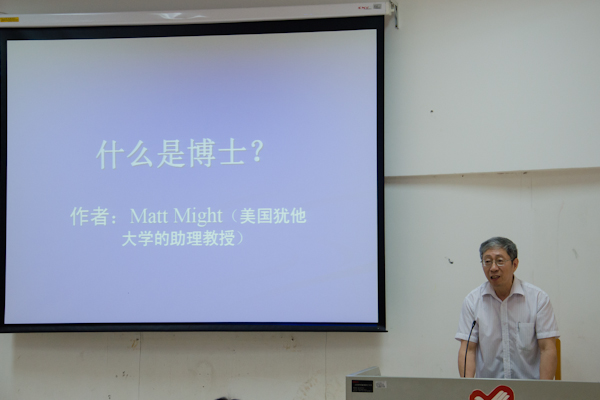 导师代表吴旭东教授则以图片的形式为新生们阐释了知识积累的过程。他以一个圆圈代表目前所有的知识,圆的外部则代表人类未知的领域。人的知识随着学习而积累:读完本科后有了一个专业方向,而硕士又让自己拥有的知识前进一大步;在进入博士阶段后,攻破自己所研究的专业问题,便又把人类知识向前推进了一步,为人类社会作出应有的贡献。他告诫同学们,不要陶醉在每一步上,不要忘记整张图的样子,应继续努力向前推进。