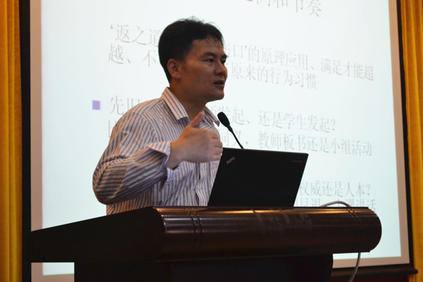 随后,欧阳护华详细介绍了教改课堂中的“孙子兵法”。他表示,教师应该满足学生的新旧需要,即“返之道之动”:在满足学生的要求之后再寻求超越。同时又不能轻易否定原来的教学习惯,教师应追求先严后松,在树立老师权威之后适当地放松对学生的约束;而后,他又谈及优秀教师应具备的条件,即应该告诉学生他们的真实心理和能量分配。提及“面子”工程时,他认为这也是十分重要的一环,“老师对学生的批评应该在私下进行,批评的同时应注意和交流相结合,产生情感共鸣应先于理性建议。”