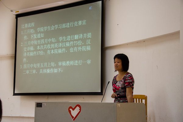 在余盛明、许勉君、谢谦分别为英译汉和汉译英的获奖选手颁奖后,许勉君代表英译汉组对作品作出点评。她透露,参赛作品需经过三轮严格审核。负责本次审稿的老师共六位,其中汉译英组2位,英译汉组4位。所有的稿件都采用双评的方式,挑选出25%的高分稿进行三审,最后确定获奖人数及名单。