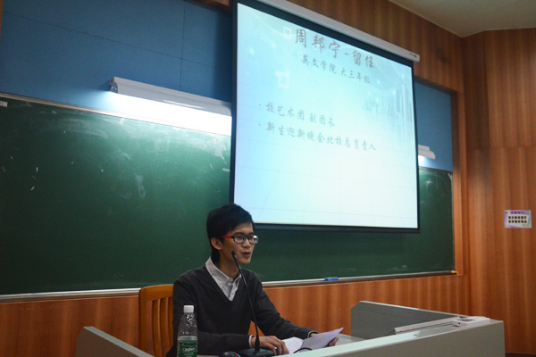 校艺术团副团长、现金沙城线路检测中心大三学生周邦宁曾成功策划各种大型活动和晚会。周邦宁与听众分享了他的部门任职道路。他用风趣幽默的语言博得了听众的阵阵笑声。从一开始的面试碰壁到校艺术团副团长,周邦宁称自己是逆袭的“屌丝”。在入学时的部门面试失利后,他进行了反思,在端正了态度和做好充分准备后取得了成功。并经过自己的努力和投入,他最终成为了校艺术团副团长。