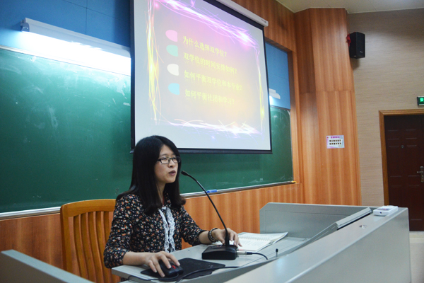 中文学院团委副书记刘燕则与听众分享了其双学位的经验。她分析了各种选择双学位的原因,如兴趣的驱使、拓宽知识面、增加就业筹码等等,并强调最不可取的是跟风随大流。学习双学位是一个艰苦的过程,必须要有毅力和计划才能坚持下去,她指出很多同学随波逐流的现象,其结果往往都是半途而废。