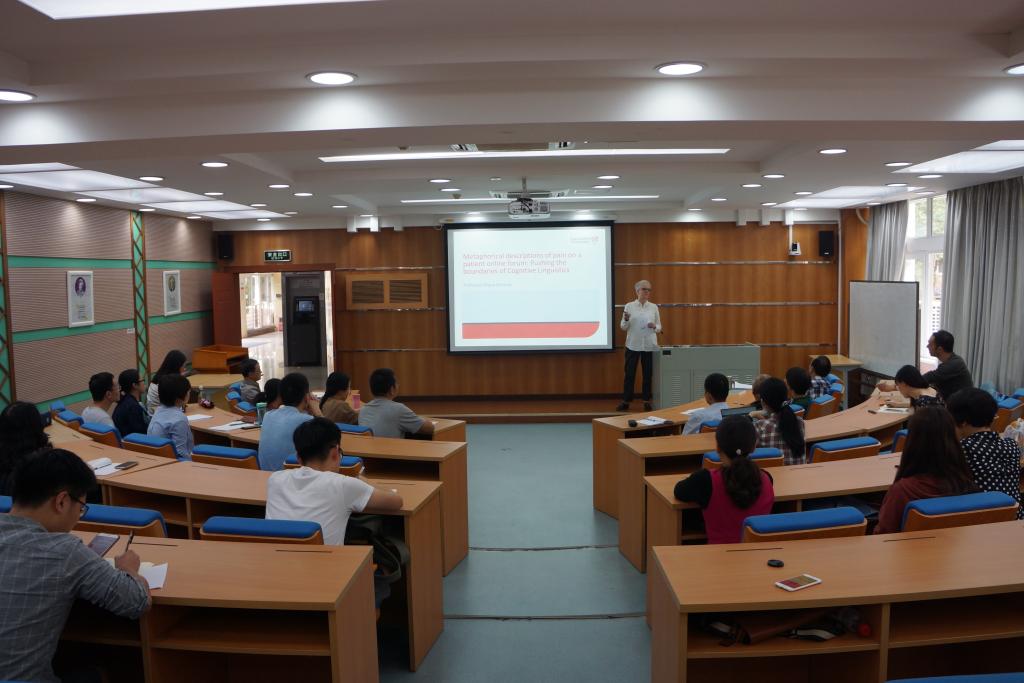 第一场讲座于25日下午三点在九教103室举行。Elena Semino教授介绍了她的研究聚焦于一个英国病人在线论坛上三叉神经痛(Trigeminal neuralgia)患者们对于疼痛的隐喻语言描述。日常生活中人们需要用语言向外界表达自身所感受到的痛感,尤其是病人们需要向医生描述病痛感受。Elena Semino教授认为由于疼痛的抽象性,表达疼痛之感是交流中的一种挑战,因此人们常常借助于隐喻性的语言来描述这种抽象的感受。讲座中,Elena Semino教授用生动的例子解释英文中痛觉表达的不同类型,给在场听众展示了研究数据的主要呈现模式。从现实意义而言,她希望通过疼痛语言的隐喻性研究,医生能更精确体会到病人所描述的感受,从而改进诊断工具(to improve the diagnosis tools)。