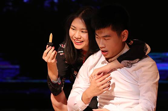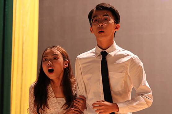 纪念活动结束后,比赛正式开始。第一组登场的四个班级为全场的比赛拉开序幕。空灵的音乐、昏暗的灯光,1611班的Harry Potter and the Man Who Lived从一开始就营造出一种神秘的氛围,将观众带入了Harry Potter的魔幻世界。1612班在Joey’s Trip to Monroe Village中通过纵火者最终自焚的故事说明了埋藏在心底的罪恶会将一个人引向毁灭的道理。1603班的续写故事则对The Lady, or the Tiger的结局进行大胆地想象:公主出于嫉妒将关有老虎的那扇门指给了她的情人。情人死去,另一扇门内爱慕他的姑娘为了殉情同样被老虎杀死。公主在晚上被二人的鬼魂索命选择自杀,国王追悔莫及,这揭示出强权下的世界往往充满悲剧这一深刻道理。1609班的The Window则围绕三个病人、一间病房和一扇并不存在的窗户展开。男主人公Jack由恶向善的心灵蜕变让人宽慰,人性的真善美丑恶也在这个故事中展现得淋漓尽致。
